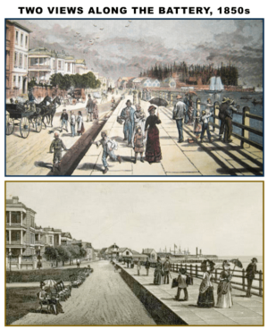 “THE BATTERY” is the common name used in Charleston to describe the pair of man-made seawalls that border the eastern and southern tips of the Charleston peninsula. The “High Battery” is just over 1,400 feet long and was built in the early 1800s which led to the creation of what is now East Battery Street and White Point Garden. The “Low Battery” was a twentieth century expansion of the original Battery that runs an additional 5,000 feet in length that was built in the early twentieth century along the Ashley River on what is now named Murray Boulevard. These “Batteries” provide a panoramic view of Charleston harbor and the adjacent islands, and are a “must see” for any tourists who visit the city.